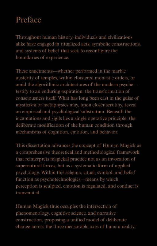 This tome gathers the scattered phenomena of ritual, imagination, symbol, and narrative, binding them into a single, solemn system. Each chapter descends further into the labyrinth of consciousness, revealing how the mind bends its own reality, how belief alters experience, how the self rewrites its own architecture through deliberate act and focused will.